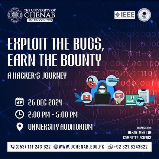 Join us for insightful workshop session ‘Exploit the Bugs, Earn the Bounty – A Hacker’s Journey’ Organised by Cybernauts Society , Department of Computer Science, the University of Chenab Gujrat .And discover how professionals turn vulnerabilities into victories.